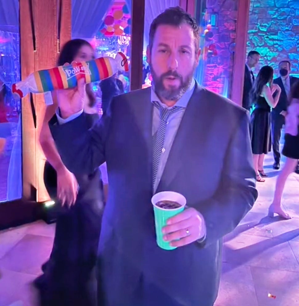 In the background of the video, the dance floor is lit up in various colors and the guests are dressed to the nines. Sandler even traded in his casual street style for a suit.