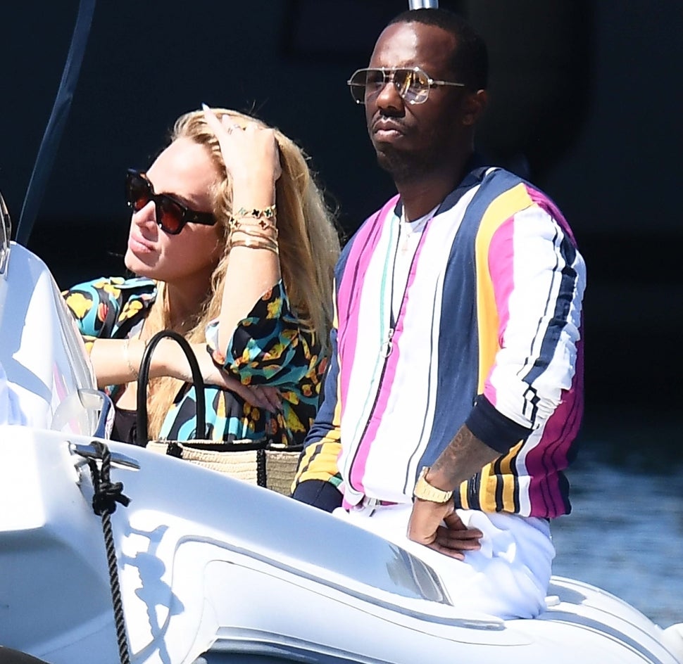 In new pictures, the “Hello” songstress sports a silk blue set and black shades, while Paul coordinates with his lady with a multi-colored sweater as they boarded a yacht.
