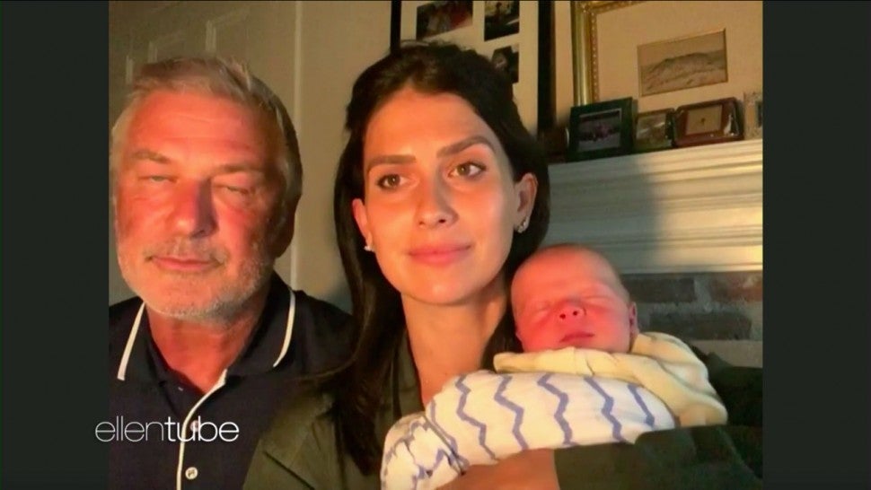 When DeGeneres brings up a photo of Alec getting a pizza while his wife was in labor earlier this month, he denies the claims and brings Hilaria and their baby boy into the camera frame.