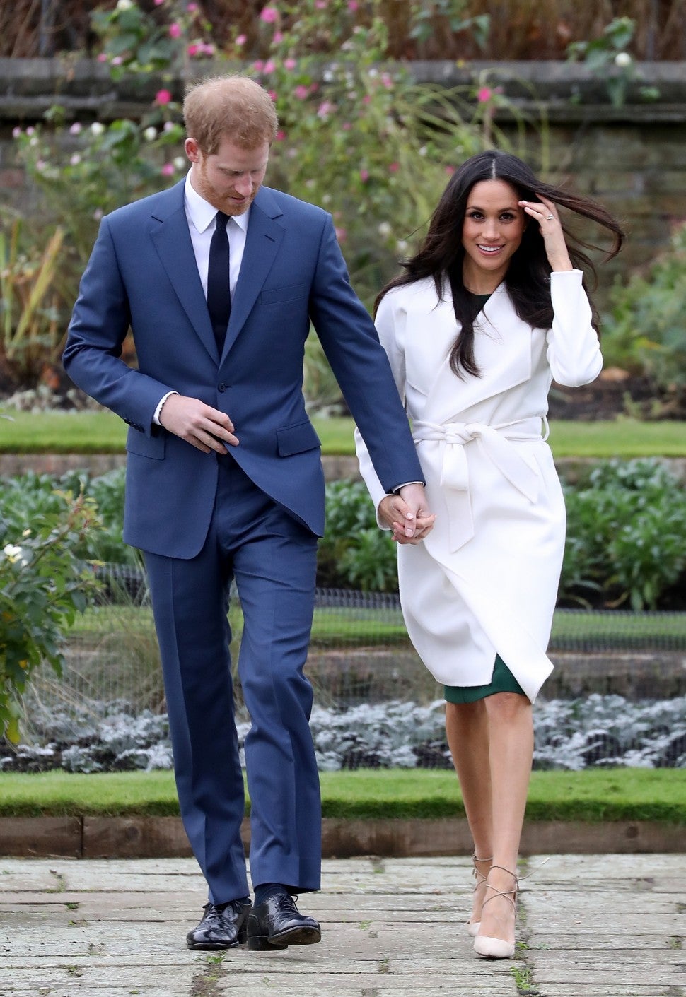 Meghan Markle looked absolutely gorgeous on Monday as she posed with her fiance, Prince Harry, in their first photos together since announcing their engagement. The 36-year-old Suits actress kept her long hair down, and while she covered up in a cozy coat, she put her toned legs on display in a pair of strappy nude heels.