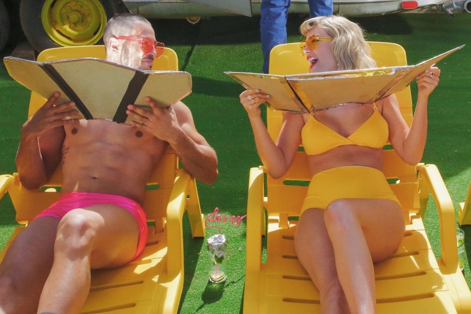 Swift sunbathes with her pals as she blocks the haters in a sunny yellow high-waist bikini from Solid & Striped, Christian Louboutin rainbow platform sandals and matching transparent heart-shaped shades from her own merch collection.