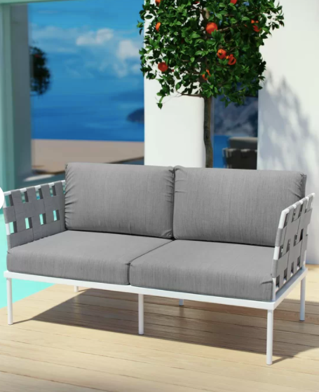 The Reyna Outdoor Patio Loveseat with Cushions is build on a modern aluminum frame and comes with gray, beige or navy cushions (which are water-resistant polyester).