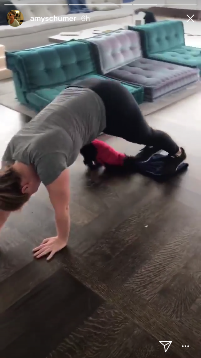 Schumer shared videos to her Instagram story on Wednesday of herself trying to focus on her workout, though Tati proved to be a little distracting.
