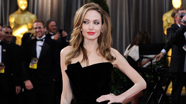 Jolie wore an olive green floor length, strapless gown that she paired with a string of bracelets, simple earrings and a silver lip cuff. Her matching pointed-toe heels could be seen peering out from the bottom of her gown.