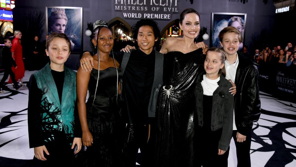 The 44-year-old actress brought five of her and Brad Pitt's six kids to the Los Angeles premiere of Maleficent: Mistress of Evil on Monday, and they posed for adorable family photos on the red carpet as she celebrated her upcoming Disney sequel. Per usual, Jolie turned heads, wearing a custom Atelier Versace dress that she paired with a scorpion accessory by Robert Procop and Cartier earrings.