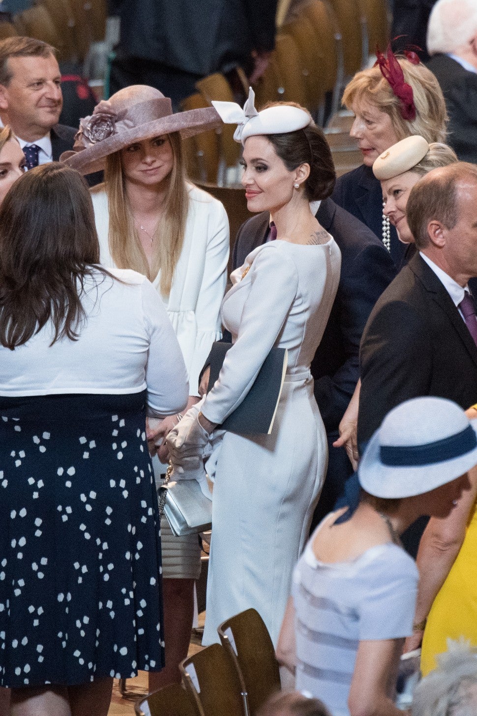 The 43-year-old actress-director attended the Service of Commemoration and Dedication at St. Paul's Cathedral in London on Thursday, and looked stunning in a custom cowl neck dove grey look from Ralph & Russo, one of Meghan's Markle's go-to designers. With a matching fascinator, gloves, clutch and sparkling broach, Jolie was the picture of sophistication.
