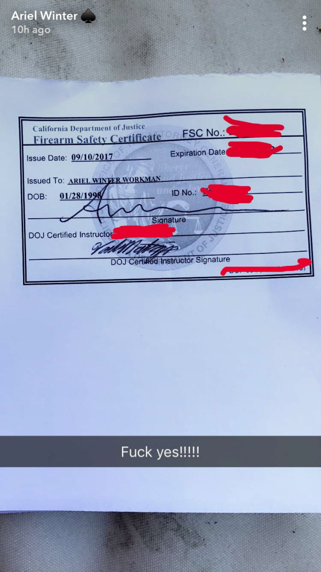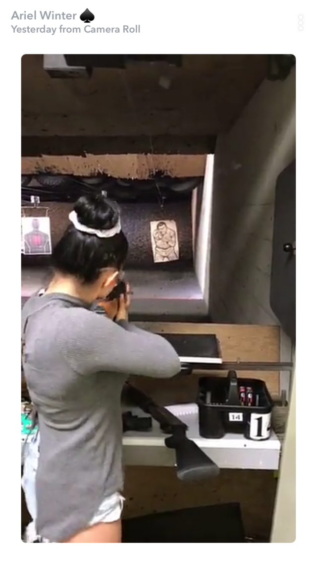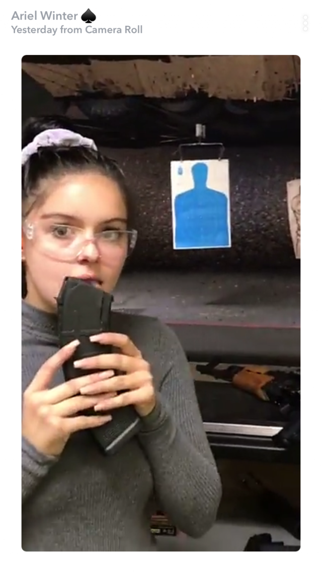 The Modern Family star took to the shooting range on Sunday, where she learned to shoot multiple weapons and even earned her Firearms Safety Certificate, which the 19-year-old actress proudly documented on Snapchat. (Warning: One NSFW F-bomb in her caption.)