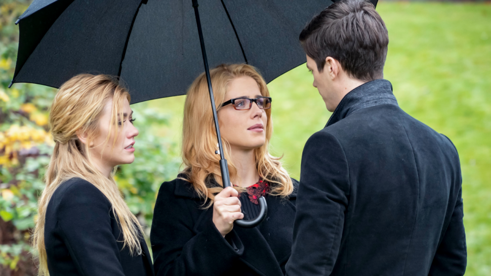 "It was really challenging," Guggenheim said of incorporating Felicity's whole story into a handful of scenes in the series finale, including the star-studded funeral at Oliver's grave. "In the case of Emily and Felicity, what worked out well was we realized we are able to schedule all the present-day story elements that we have written for her in these two days. The only thing that had to change and fall out was the flashback story had to change, which was obviously really disappointing to us. We're presented with lemons and we make lemonade, and I'm really happy with the story that David [Ramsey] and Stephen [did]. They really brought it."