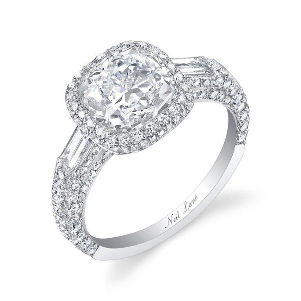 The giant sparkler features a cushion cut center stone surrounded by a halo of diamonds and is further encrusted with almost 170 smaller round brilliant diamonds and accented by two baguette diamonds. Basically, Lauren got a lot of diamonds – 3.65 carats to be exact.