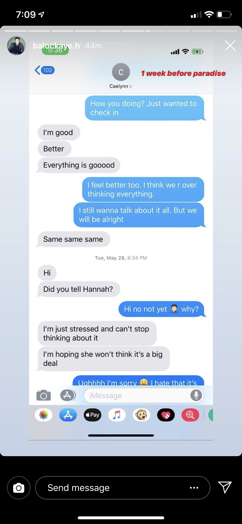 Then, before Paradise, Blake texts Caelynn saying he's thinking of pulling out of the show. She allegedly writes back questioning who seemingly found out about their hookup. "Don't stress we'll figure it out," she supposedly writes.
