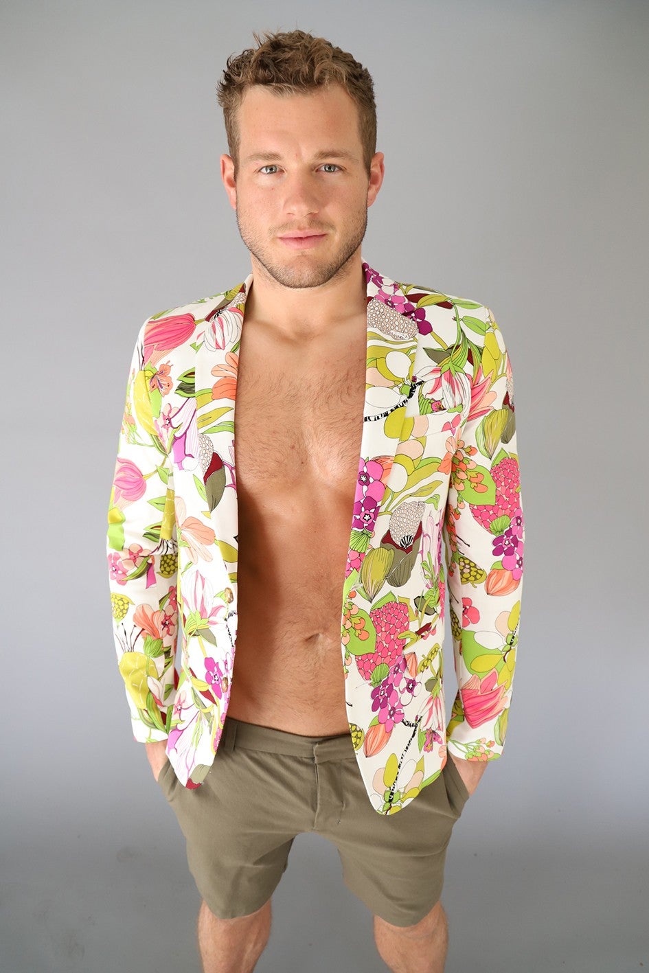 In the sizzling images, the 26-year-old tries on a myriad of different suits, including a bright purple and vivid floral design. Of course, the new TV star keeps things interesting by opting to go shirtless underneath.