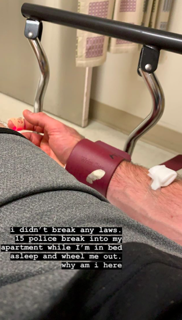 Earlier in the day, in a since-deleted Instagram Story, the Bachelor in Paradise alum posted a photo of his arm that appeared to be strapped down. "I didn't break any laws. 15 police break into my apartment while I'm in bed asleep and wheel me out. Why am I here," he wrote alongside the snap.