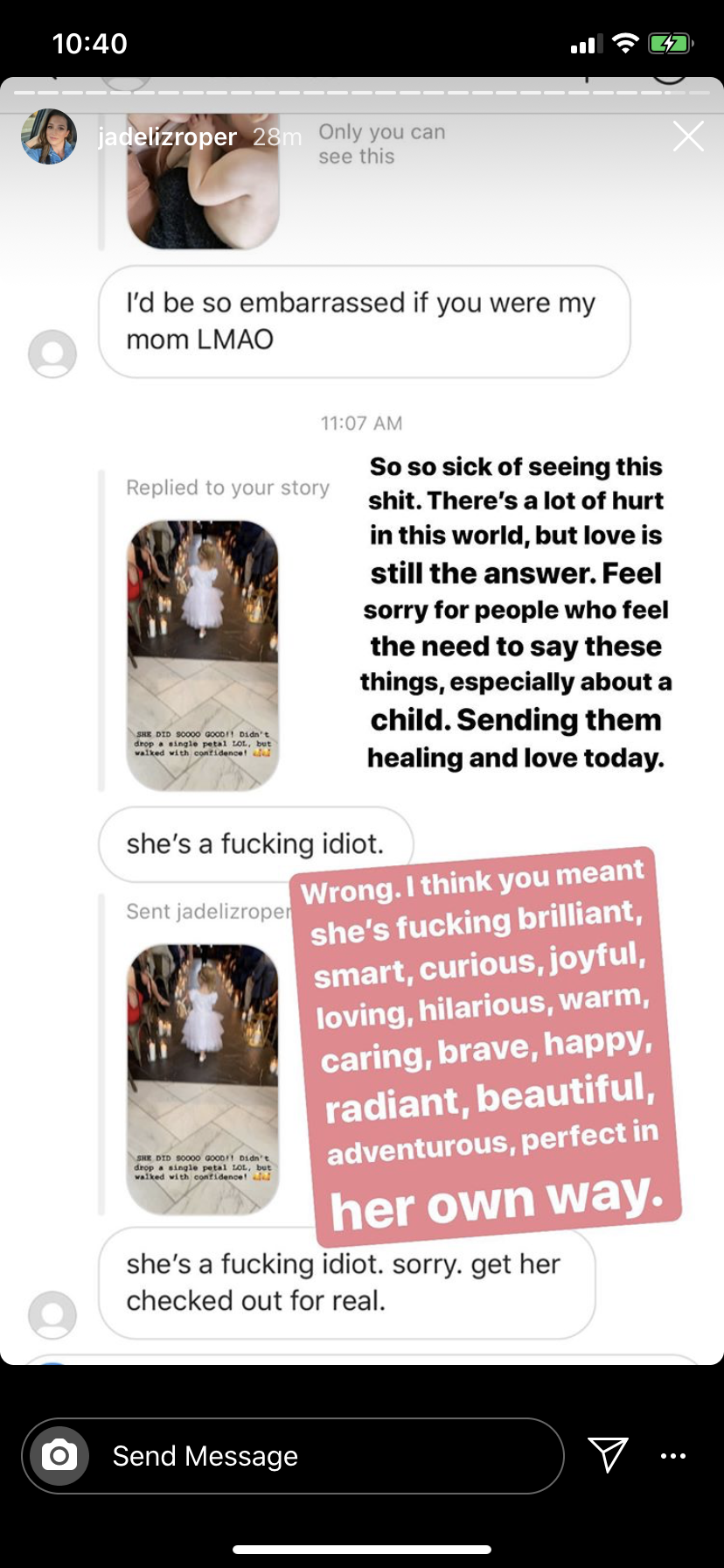 After posting the sweet clip, Roper returned to her Story to share screenshots of a message where a person called Emmy "a f**king idiot" and said that Roper should "get her checked out for real."