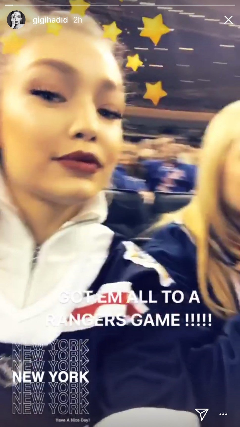 And on Gigi’s Instagram story, she may have outed herself as the biggest fan of them all, writing “Got ‘em all to a Rangers game !!!!!” as she panned over her seatmates, who also included her longtime friend, McCall Koenig.