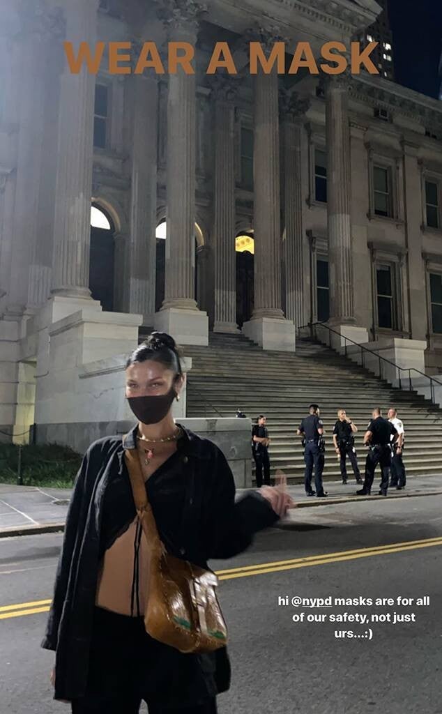 In another post, Hadid is seen giving the NYC cops the middle finger. "Hi @NYPD, masks are for all of our safety, not just urs," she wrote.