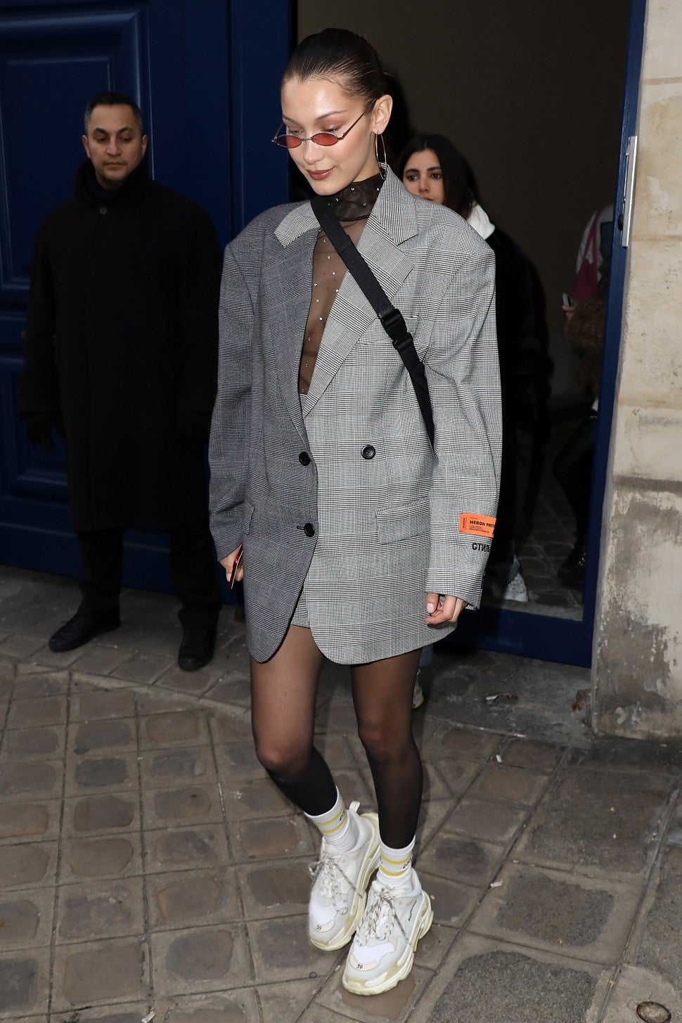 Hadid kept things comfy as well, adding on white ankle socks and Balenciaga sneakers. She accessorized with small-framed rose-colored sunglasses, gold hoop earrings and a black cross-body bag.