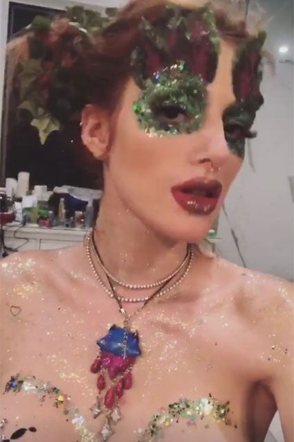 The Famous in Love star celebrated turning 20 with a costume party, and her getup included a whole lot of body makeup that seemed to replace her wearing a shirt. Thorne appeared to be dressed like Batman villain Poison Ivy with ivy leaves in her hair and attached to her large white platform boots. She sported white skinny jeans and a lime green metallic jacket with no shirt underneath, keeping her coat open to show off her glittery body art.