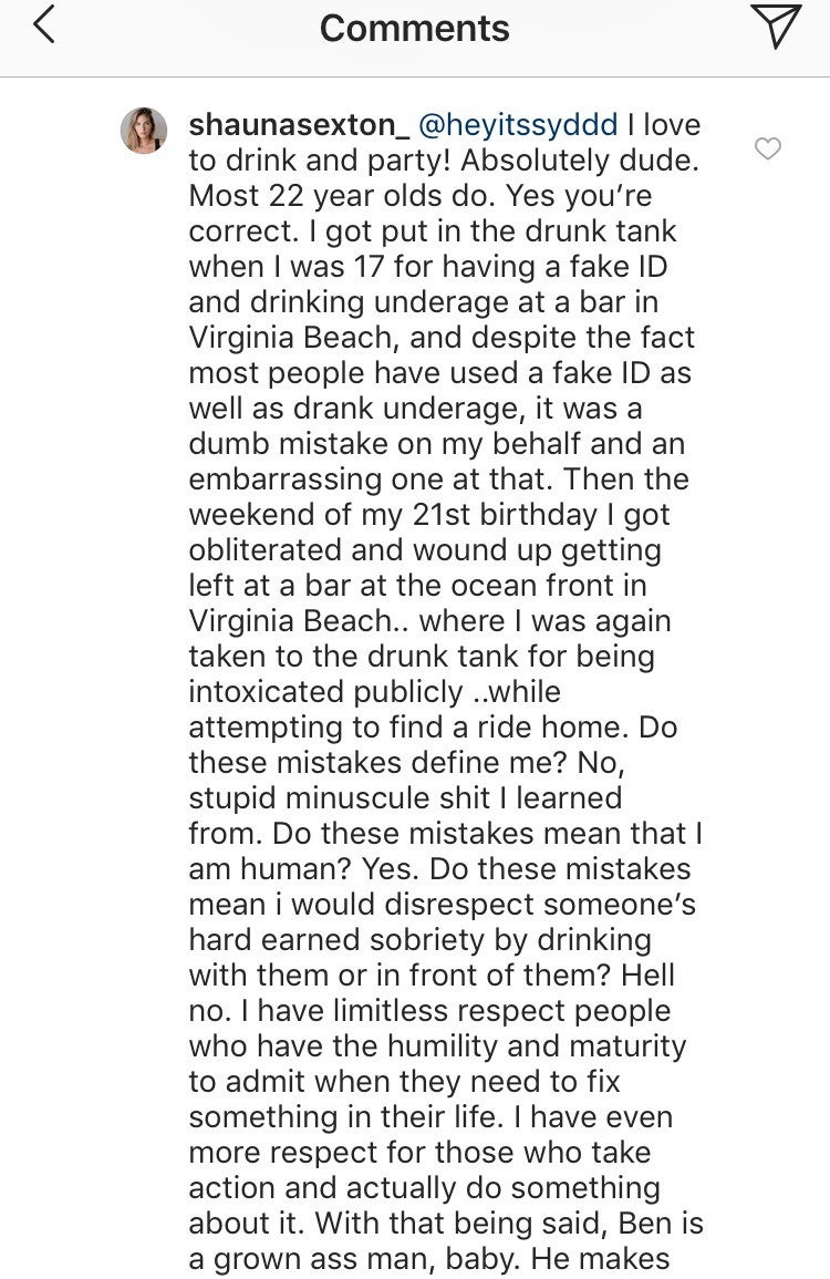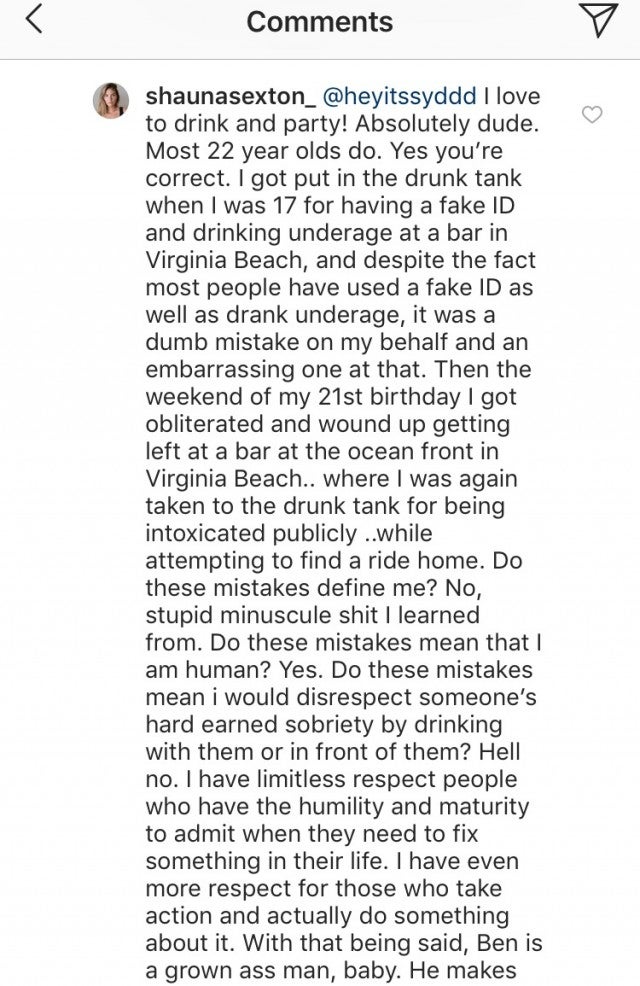 “I love to drink and party!” she responded. “Yes you’re correct. I got put in the drunk tank when I was 17 for having a fake ID and drinking underage at a bar in Virginia Beach, and despite the fact most people have used a fake ID as well as drank underage, it was a dumb mistake on my behalf and an embarrassing one at that… Do these mistakes define me? No, stupid miniscule sh*t I learned from. Do these mistakes mean that I am human? Yes. Do these mistakes mean I would disrespect someone’s hard earned sobriety by drinking with them or in front of them? Hell no. I have limitless respect [for] people who have the humility and maturity to admit when they need to fix something in their life.”