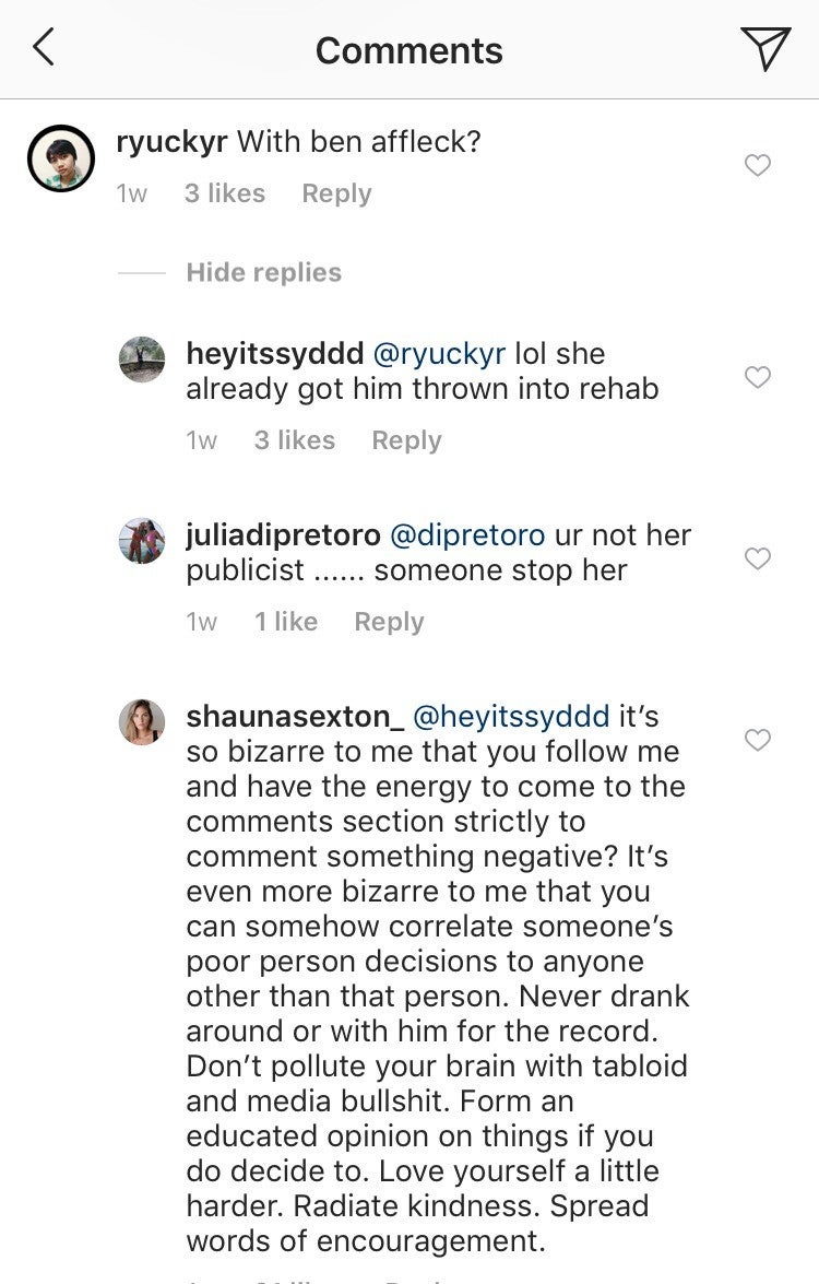 “It’s so bizarre to me that you follow me and have the energy to come to the comments section strictly to comment something negative,” she wrote. “It’s even more bizarre to me that you can somehow correlate someone’s [poor decisions] to anyone other than that person. Never drank around or with him for the record.”