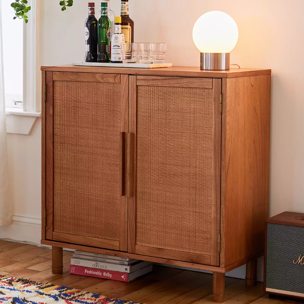 Woven doors mix mid-century modern design and boho style on this charming wooden bar cabinet.