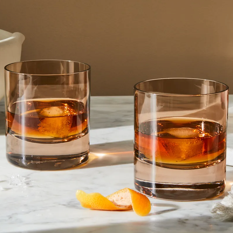 For the cocktail connoisseur, Estelle Colored Glass' selection of hand-blown glassware comes in so many stunning colors, including this pair in sophisticated smokey amber.
