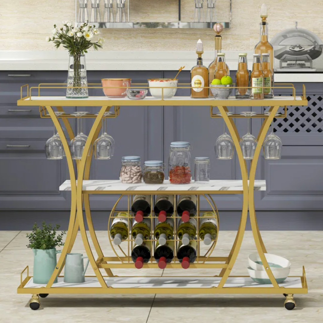 Give your home a touch of old-world glamour with a gold bar cart, complete with a wine rack and glass hanging rack.