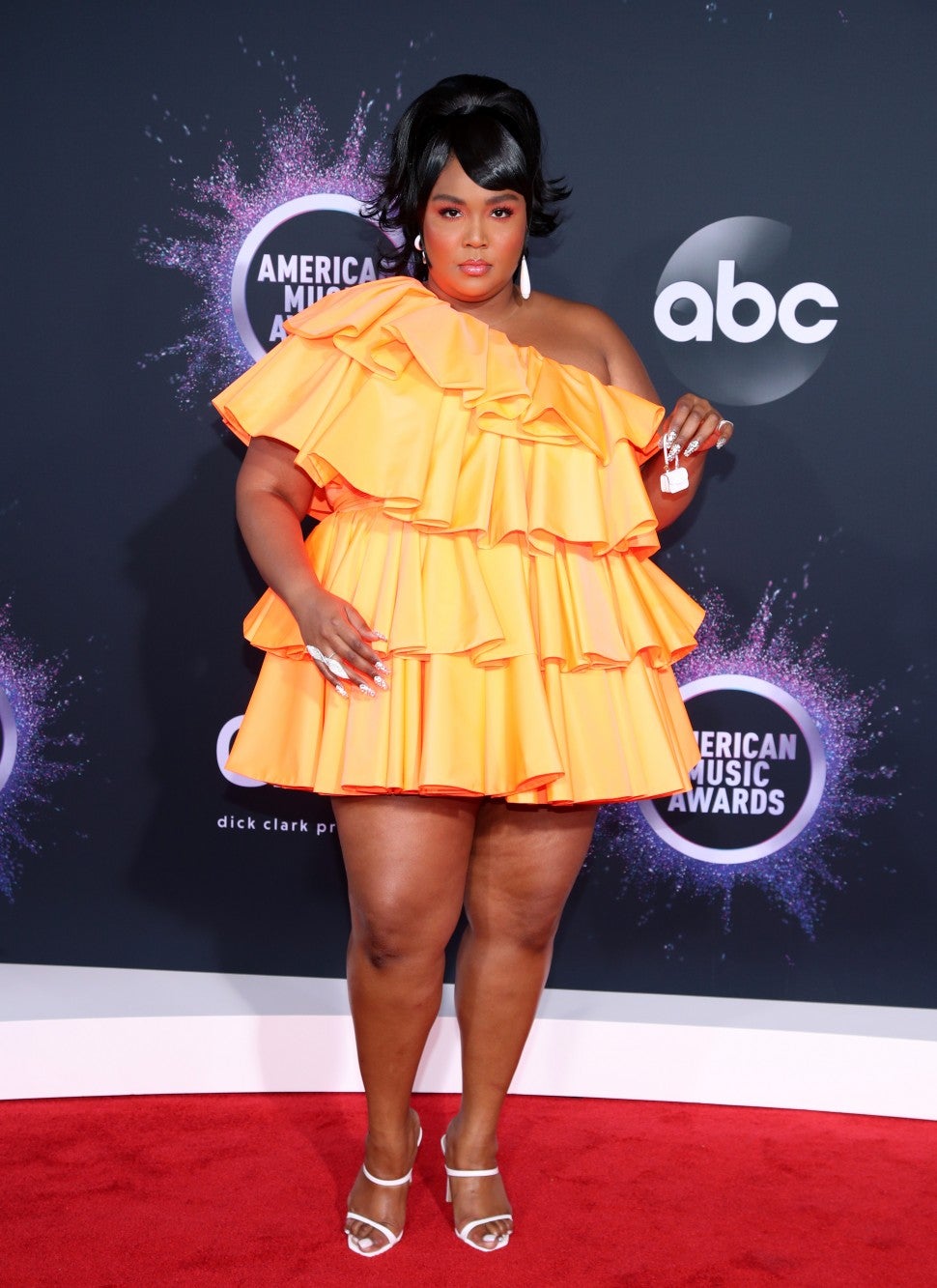Lizzo shut it down in a creamsicle orange tiered one-shoulder number by Valentino. The best part? She carried the tiniest purse we've ever seen.