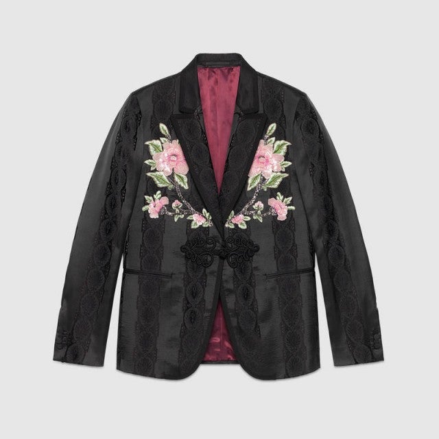 The Thirty Seconds to Mars stud wore Gucci Cruise 2018 black trousers and jacquard evening jacket with floral embroidery detail, totaling $8,000. Leto completed the all-Gucci look with a white evening shirt, $730 black leather horsebit loafers and a statement black velvet floral embroidered coat, which costs $3,980.