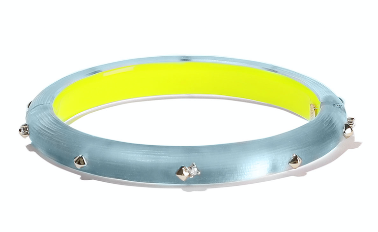 Your fashionable BFF will love the contrasting colors on this Lucite bracelet, and the studs add a bit of cool-girl toughness, too.