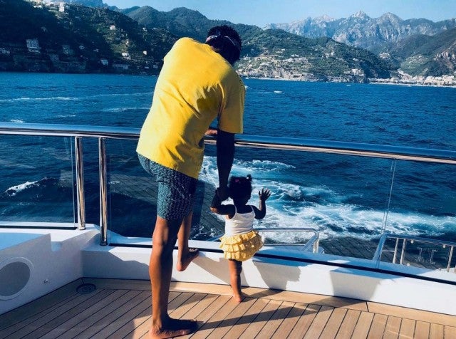Beyonce also posted another heartwarming photo of Rumi, as the toddler held her dad's hand while they stood at the back of an enormous yacht, watching the wake as they traveled through idyllic European waters.
