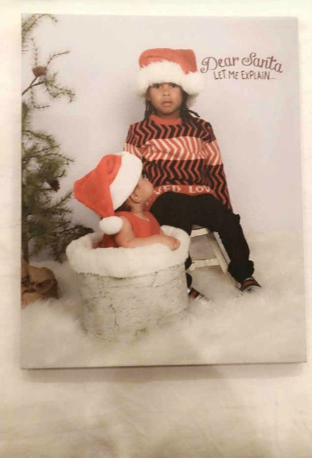 In one pic, the brother and sister wear festive sweaters with little Santa hats. In another, Dream is in a chimney looking up at her big bro, and the card reads "Dear Santa, let me explain."