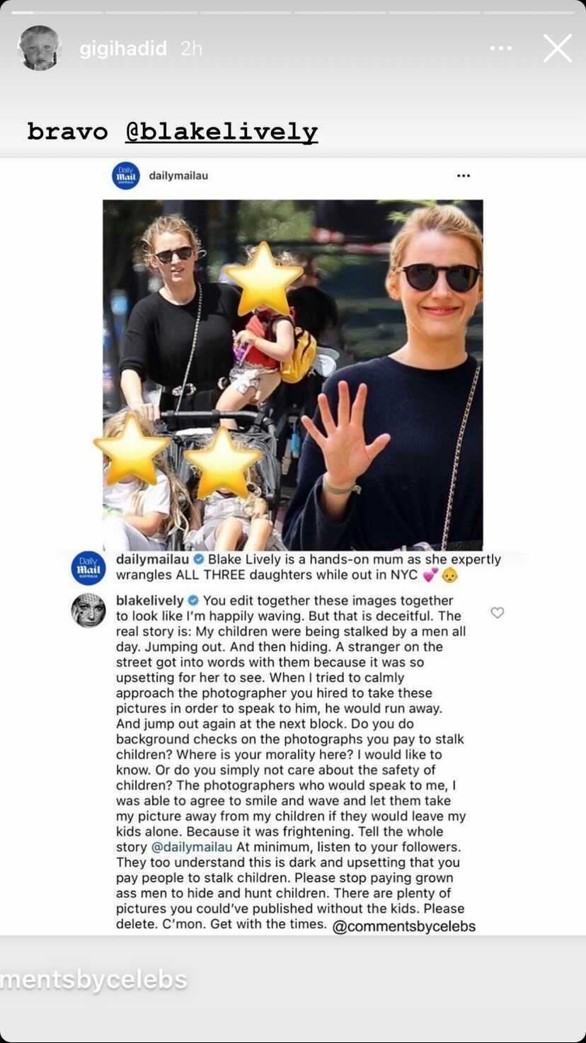 Fellow mom and celeb friend Gigi Hadid also reposted Lively's comments on her Instagram Story.