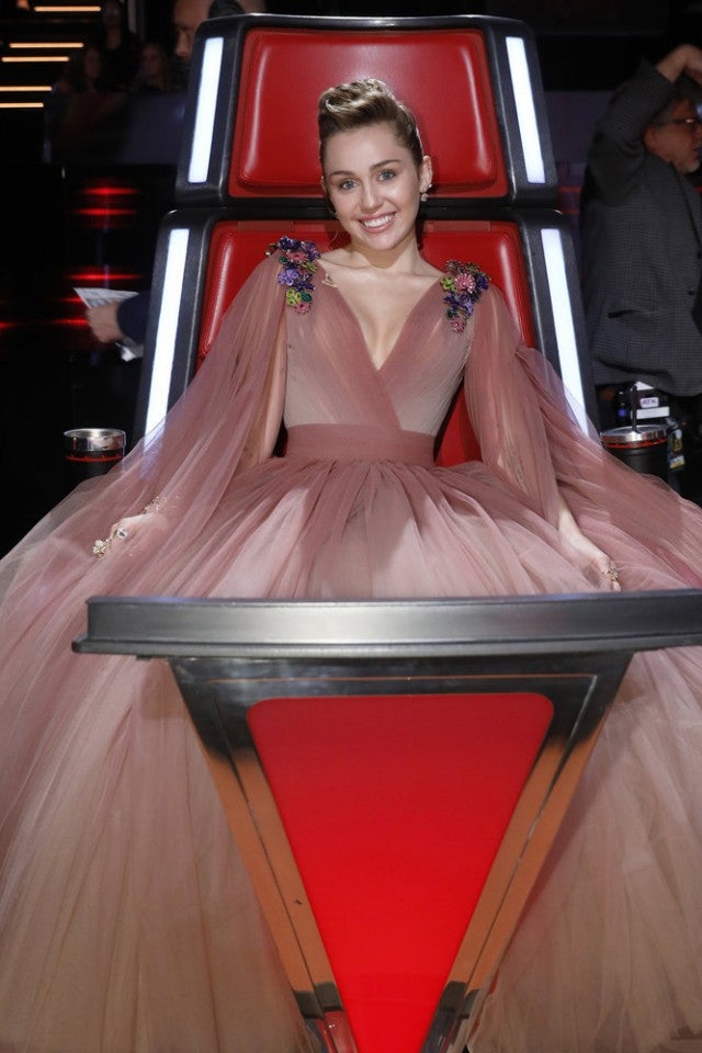 Miley Cyrus looked positively ethereal in a flowing rose-hued tulle Nicolas Jebran gown with bright floral appliques at the shoulders, a look that gave off butterfly vibes.