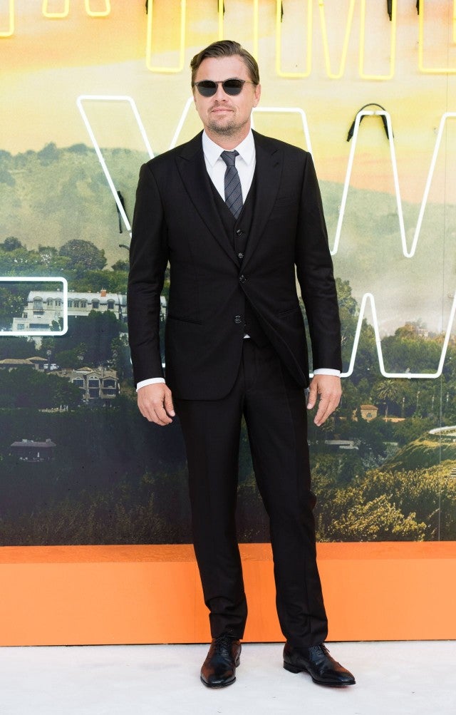 DiCaprio, clad in a classy three-piece suit, striped tie and leather shoes, shaded his eyes with a pair of Oliver Peoples sunglasses.