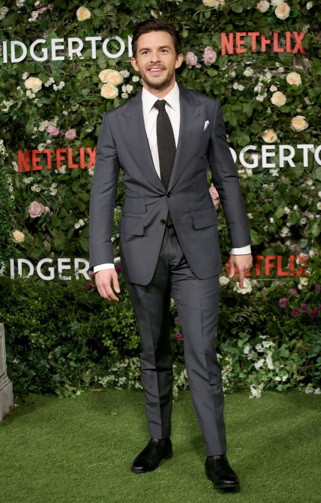 Lord Bridgerton himself sure cleaned up nicely. Bailey, who takes the reins as the leading character during the show's second season, wore a fitted charcoal suit for the occasion. Bailey paired the suit with a white shirt, black tie and black dress shoes.