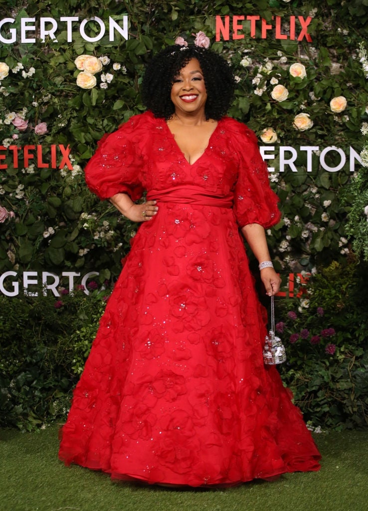 Rhimes, the show's talented creator, was also in attendance at Tuesday's premiere. In a modern take on Bridgerton's flouncy frocks, Rhimes wore a red ballgown, that featured puffed sleeves and floral embroidery throughout. The dress also had silver, sequined details stitched into the gown. Rhimes paired the dress with a whimsical, silver clutch, that appeared to resemble a castle.