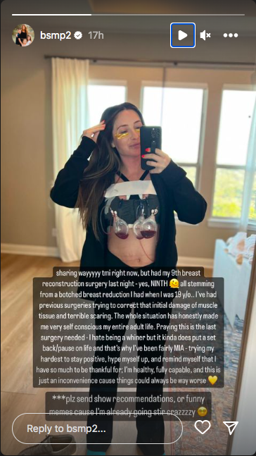 Bristol Palin is opening up about an ongoing struggle she's been dealing with since the age of 19. The 32-year-old daughter of Sarah Palin and former Teen Mom OG star took to her Instagram Stories to share that she recently underwent her ninth breast reconstruction surgery.
