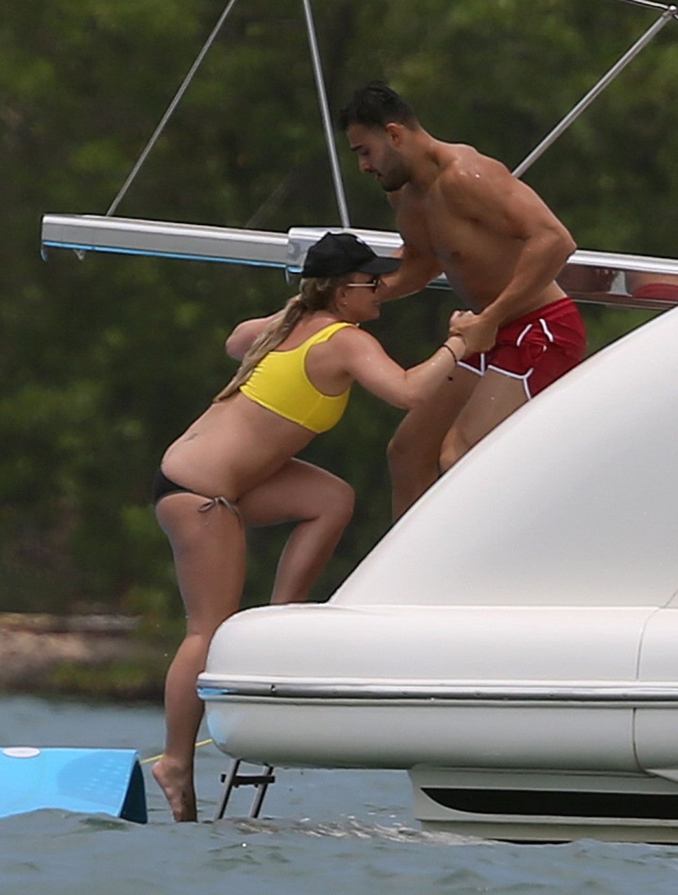 Paparazzi also snapped pics of Asghari helping a bikini-clad Spears onto a boat, after the two had some fun taking turns diving into the water: