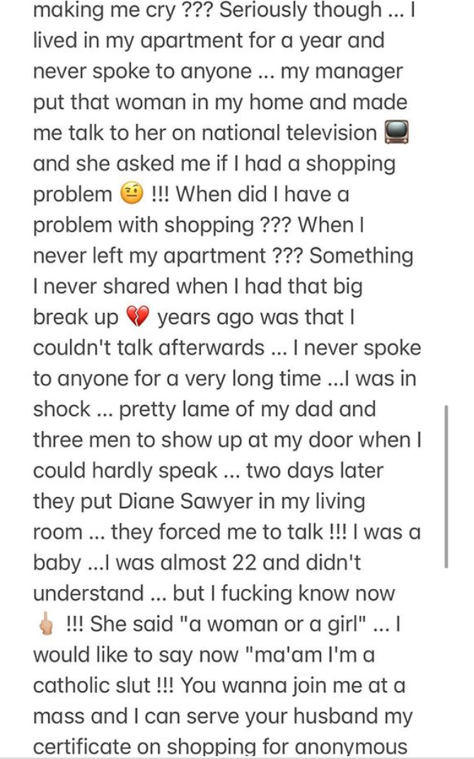 She continued, "When did I have a problem with shopping??? Something I never shared when I had that big breakup years ago was that I couldn't talk afterwards. I never spoke to anyone for a very long time ...I was in shock... pretty lame of my dad and three men to show up at my door when I could hardly speak... two days later they put Diane Sawyer in my living room."