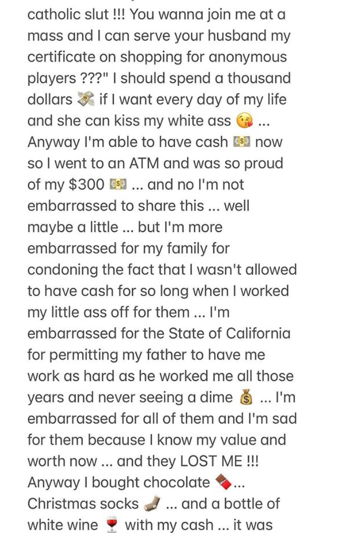 "Anyway I am able to have cash now so I went to an ATM and was so proud of my $300... and no I'm not embarrassed to share this ... well maybe a little ... but I'm more embarrassed for my family for condoning the fact that I wasn't allowed to have cash for so long when I worked my little a** off for them," she explained before pointing the finger at the state of California for how they handled her conservatorship over the years.