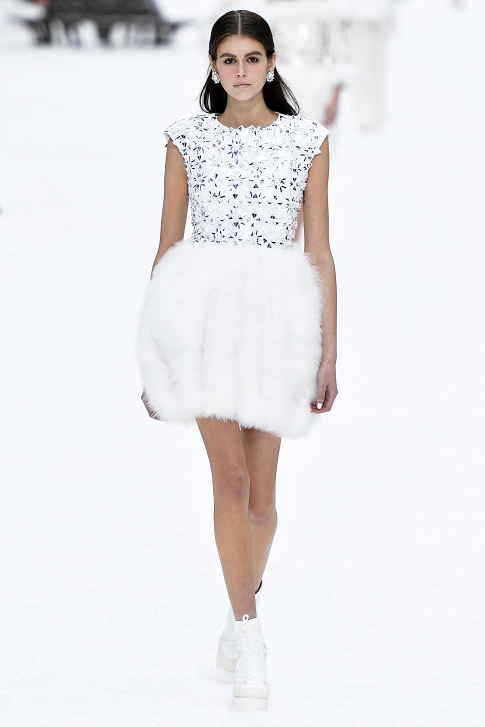 Penelope Cruz, who became the face of the brand last year, gave us supermodel vibes for her runway debut, donning a white tiered ruffled sweater, fuzzy mini skirt and platform snow boots as she carried a white rose, paying tribute to Lagerfeld.