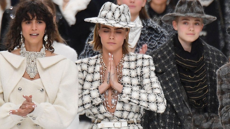 Cara Delevingne, who appeared in many campaigns for the design house, opened the show in a stunning black-and-white checked tweed belted jumpsuit, matching hat, layered necklaces and a houndstooth coat. Delevingne also led the finale walk with fellow models who got teary during the emotional show.