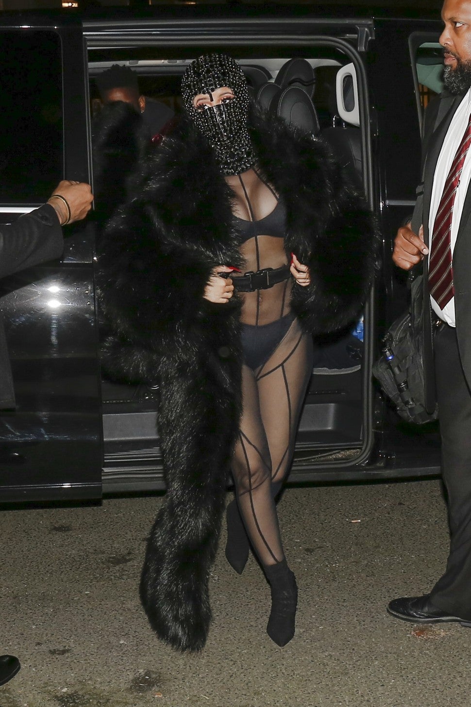The 27-year-old rapper was a show-stopper while attending an event during Men's Paris Fashion Week on Thursday. Cardi arrived to the Laundered Works Corp show -- designed by her husband, Offset – in a see-through Mah-Jing Wong catsuit with a black bra and underwear. She covered up in a chic Adrienne Landau faux fur coat and a bedazzled ski mask by CoutureMask that only showed her eyes.