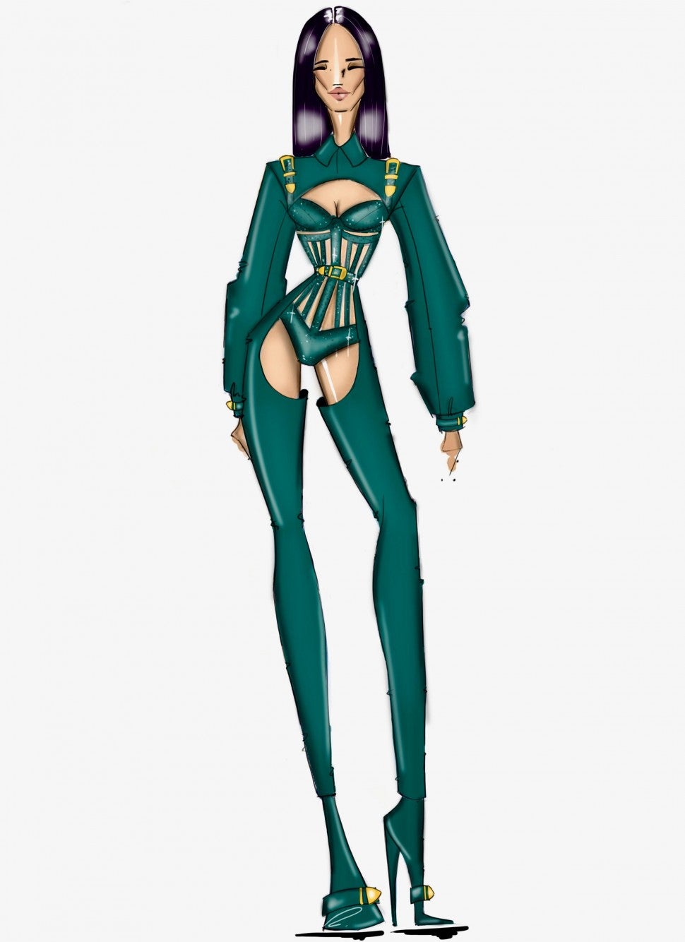 First, she wowed in a hunter green caged, crystal-embellished bodysuit, worn with a balloon-sleeved top and chaps, during her sexy performance of her hit singles, "Clout" and "Press," with husband Offset. The edgy ensemble was custom designed by Bryan Hearns.