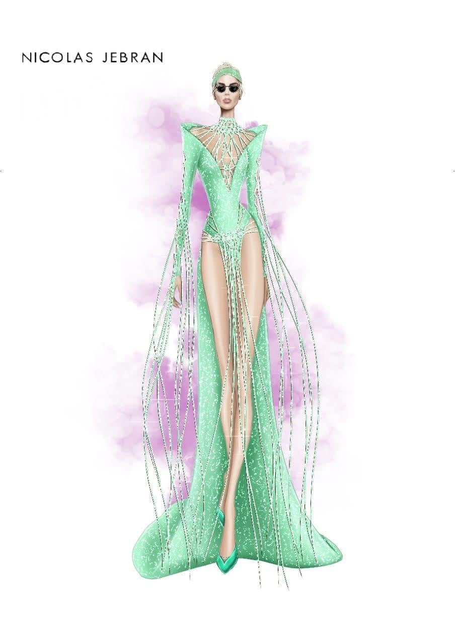 She then changed into another custom designed look, this time by Nicolas Jebran. Cardi stunned in a bright lime green Swarovski crystalized gown. The dress featured shapely statement shoulders, a plunging netted neckline, floor-trailing train and fringe hem detail.