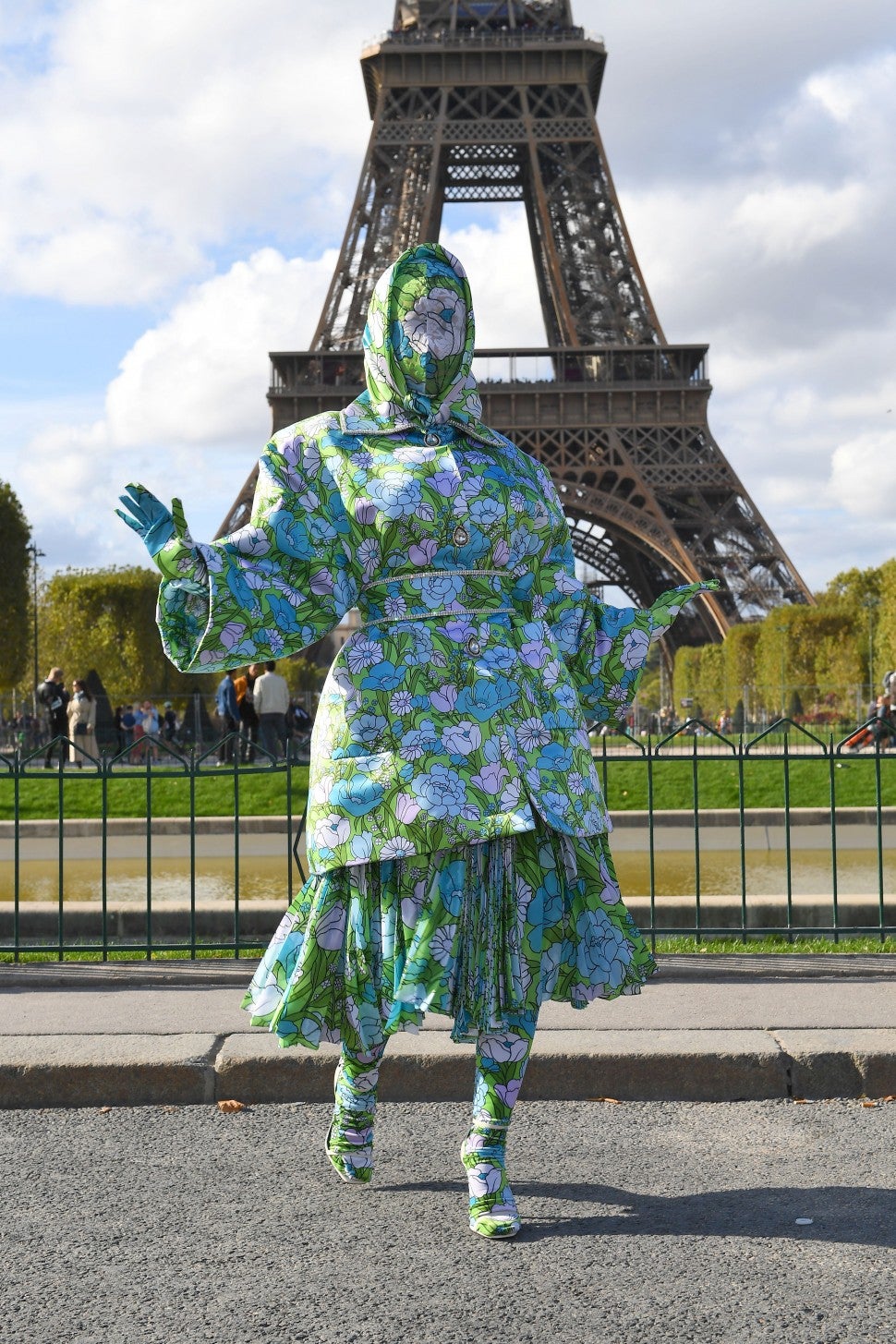 The rapper posed in her Richard Quinn ensemble near the Eiffel Tower on Saturday.