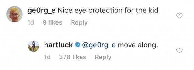 When one commenter sarcastically wrote, “Nice eye protection for the kid,” Hart replied, “Move along.”