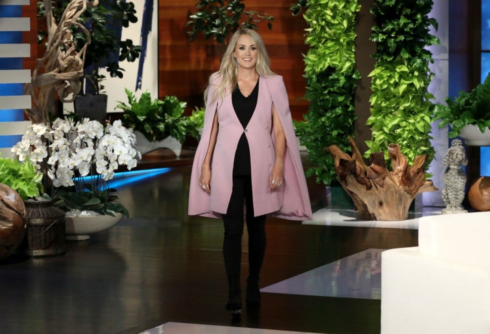 Underwood also might be hinting at a girl in her outfit choices. The “Cry Pretty” singer is wearing a pale pink cap jacket on Ellen, and was also sporting a pink jacket during her baby announcement video.
