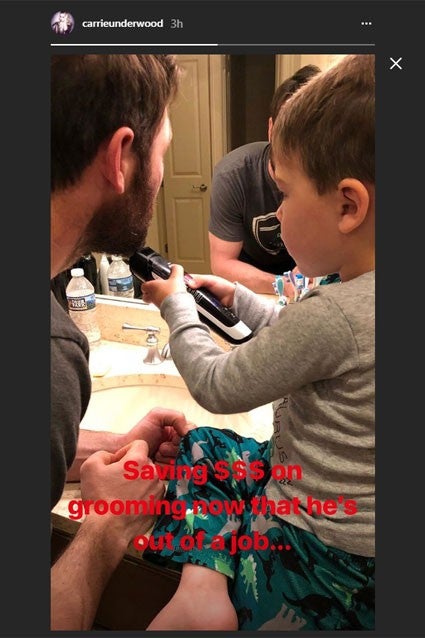 On her Instagram Story, the "Cry Pretty" singer also posted a pic of the father-son moment, writing: "Saving $$$ on grooming now that he's out of a job..."
