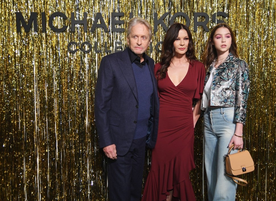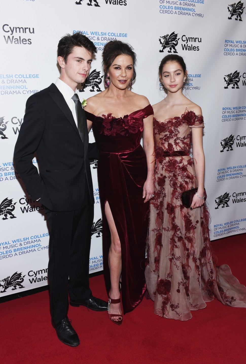 The stunning actress -- who shares Carys and Dylan with husband Michael Douglas -- looked glamorous in a burgundy, off-the-shoulder velvet gown, which she paired with matching heels and dangling earrings. Her mini-me was equally as beautiful in a cranberry-and-beige floral dress. Both mother and daughter had their hair swept in an elegant updo. Her son looked dapper in a black suit.